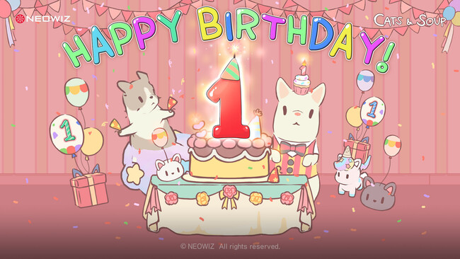 株式会社NEOWIZ(本社:韓国 京畿道城南市、共同代表:金 承徹(キム・スンチョル)/裵 泰根(ベ・テグン)がサービス中の癒し系放置型ゲーム『猫とスープ(Cats&Soup)』(開発:ハイディア (代表キム・ドンギュ))は、本日2022年9月8日(木)よりリリース1周年を記念した誕生日パーティーコンセプトのイベントを開始いたします。