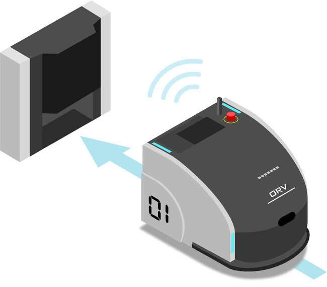 「ORV」は、SLAM技術を活用し、センサーで周囲の環境を把握して周辺地図の作成と自己位置推定を行い、目的地まで最も効率的なルートを導き出します。走行ルート設定の自由度が高く、床面工事や経路テープやマーキング、ルート設定のためのランドマークなどが必要ないため、レイアウト変更や動作エリアの拡張に柔軟に対応できます。AI(人工知能)によりカゴ車を自動認識して取りに行き、マーキングや人の手による位置合わせなしで、カゴ車の片側を自動でつかみ上げます。カゴ車の片側をつかみ上げる「片持ち方式」で移動するため、その場旋回など小回りが利き、カゴ車と一体となったバック走行も可能です。走行中は、障害物を検知して回避します。狭い通路では回避ではなく一時停止をするなどルートに応じた動作設定ができます。目的地に着くと、カゴ車と一体になったバック走行で整列配置を行うことができ、トラックバース前の出荷待機や垂直搬送機などへの搬送が可能です。自動充電機能を備えており、充電が必要になると設置している給電装置に自動で向かい、充電します。また、IoT遠隔監視システムにより、稼働データをクラウド上にアップロードしているため、現場で不具合が起きた際にはログデータを基に離れた場所からでも調査をすることが可能です。
