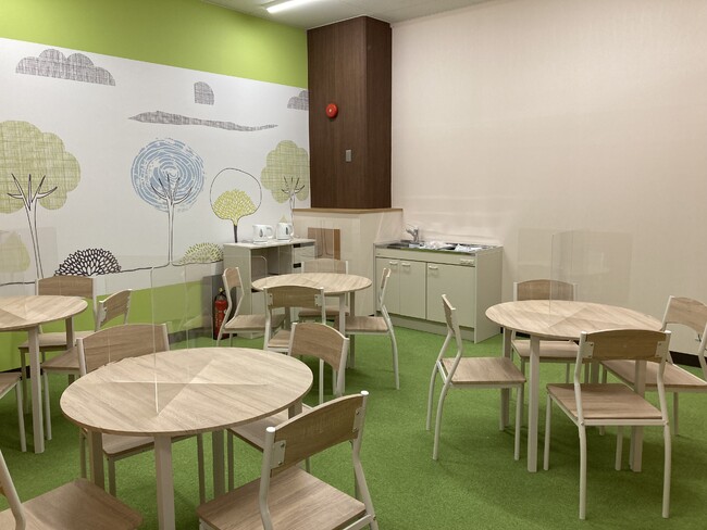 柱を樹木のカラーにし空間認識のストレスを軽減し、使用用途ごとに壁紙や床材を分けて、脳波と体内時計をコントロールを促すBGM等を採用しています。