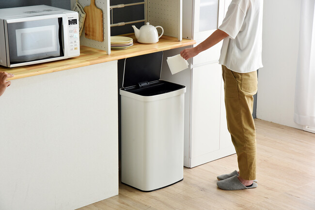 非接触でフタの開閉を行うことから、キッチンに置けば、料理などで両手がふさがっている場合でも、手を伸ばすだけで簡単に生ゴミを捨てることができてとても便利です。また、ゴミ箱に手を触れずにゴミを捨てることができるので衛生的です。赤ちゃんのおむつやペットのゴミを捨てる時にも重宝されます。