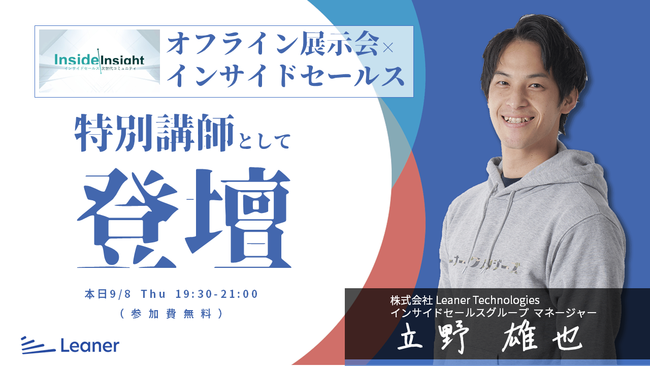 調達・購買部門向けのクラウドサービス「Leaner」を提供する株式会社Leaner Technologies(本社:東京都品川区、代表取締役:大平裕介)の社員、インサイドセールスグループ マネージャー立野 雄也が、本日2022年9月8日(木)にオンライン開催する「オフライン展示会×インサイドセールス 展示会の成果を最大化させる3つのポイント」に特別講師として登壇します。セミナーおよびパネルディスカッションを通して展示会における様々なポイントをお伝えします。奮ってご参加ください。