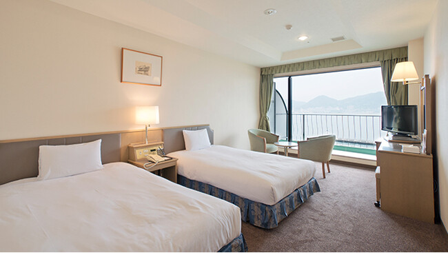下関グランドホテルの海側のツインルームです。お部屋からはバルコニーへ出られ、遠くに響く汽笛や海風の心地よさを心行くまで味わっていただけます。 お部屋は洗面所とバス、トイレ全てがセパレート。ゆっくりと身体を休め、お寛ぎいただけます。