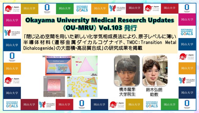 本号では、学術研究院自然科学学域(工)の鈴木弘朗助教と本学大学院自然科学研究科博士前期課程2年の橋本龍季大学院生らの研究グループが成功した、閉じ込め空間を用いた新しい化学気相成長法により、原子レベルに薄い半導体材料(遷移金属ダイカルコゲナイド、TMDC:Transition Metal Dichalcogenide)の大面積・高品質合成についての成果を紹介しています。
