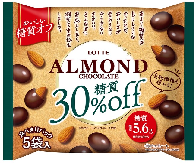 ロッテアーモンドチョコレートから、おいしさそのままに糖質を30%オフ※したタイプが新登場。
