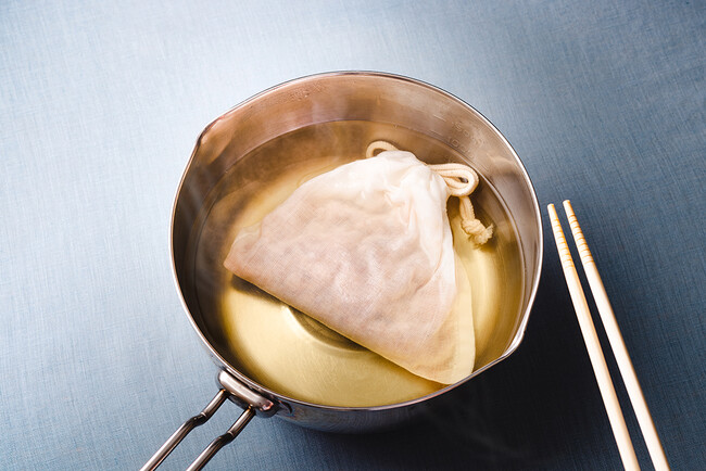 3.箸やお玉でだしこし袋を取り出しますと、約350mlのだしがひけます。