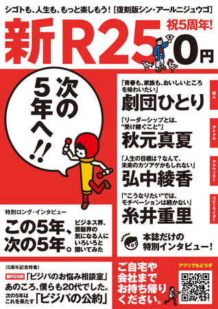 そしてこのたび「新R25」5周年を記念し、メディアの起源である旧「R25」のコンセプトを受け継いだ復刻版フリーペーパーとして、紙版「新R25」を限定部数で発行いたします。「R25」のメインCMキャラクターを務めていたタレント・劇団ひとりさん、キャプテン就任3年目を迎えた乃木坂46・秋元真夏さん、モチベーティブに走り続けるコピーライター・糸井重里さん、5年間で数々の人気番組に出演したテレビ朝日アナウンサー・弘中綾香さんなど豪華キャストの仕事観や人生観を特別にインタビュー取材しています。