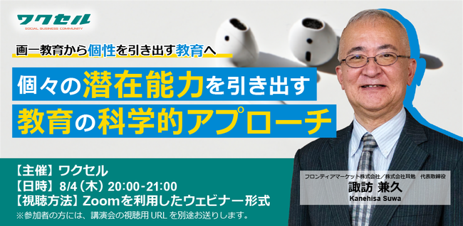 ソーシャルビジネスコミュニティ ワクセル(主催:嶋村吉洋)は、フロンティアマーケット株式会社、株式会社 耳勉 代表取締役の諏訪兼久(すわかねひさ)さんを講師に招いて、オンライン講演会を開催しました。テーマは「個々の潜在能力を引き出す!教育の科学的アプローチ」です。