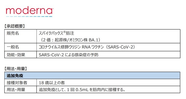 モデルナ、オミクロン株対応の追加接種用2価ワクチン「スパイクバックス(R)筋注」(2価:起源株/オミクロン株BA.1)の一部変更承認を取得
