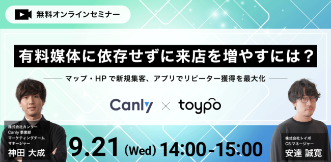 『有料媒体に依存せずに来店を増やすには?~マップ・HPで新規集客、アプリでリピーター獲得を最大化~』トイポ×カンリーの共催ウェビナーを9月21日に開催決定!