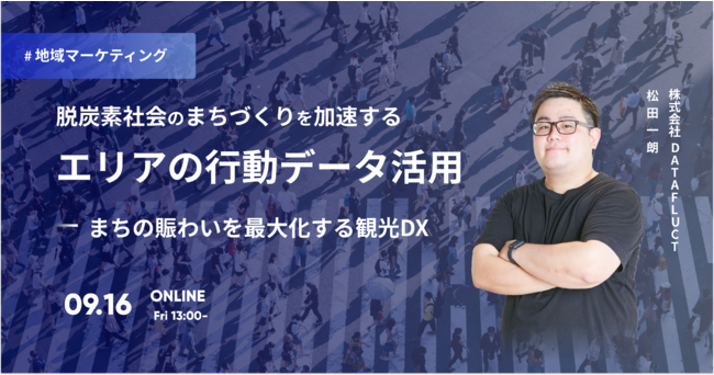 データサイエンスで企業と社会の課題を解決する株式会社DATAFLUCT(本社所在地:東京都渋谷区、代表取締役CEO:久米村 隼人、以下DATAFLUCT)は、エリアの行動データを活用した持続可能なまちづくり・観光DXの最新トレンドと、実践のためのポイントを学べるウェビナー「脱炭素社会のまちづくりを加速する、エリアの行動データ活用」を、9月16日(金)13:00から開催いたします。(オンライン開催、視聴無料、要事前申し込み)