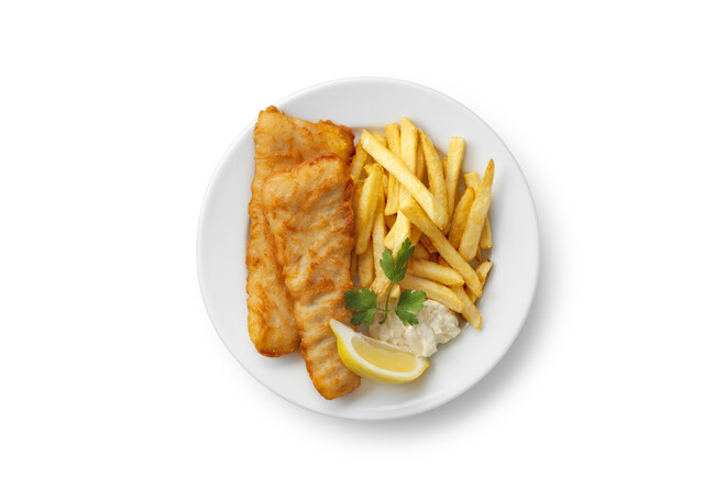 MSC認証の白身魚のフライと、たっぷりのフライドポテトをのせたボリューム満点の一皿。
