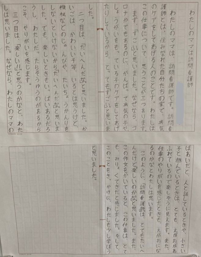実際に子育てママさん看護師の子どもが小学校で書いてきてくれた作文に、その姿が映っています。