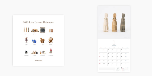 2023年の壁掛けカレンダーは2種類ご用意しております。リサの陶器作品がデザインされた「セラミックワークス」とマイキーやライオン、ハリネズミなどのパターンが描かれた「デザインコレクション」です。
