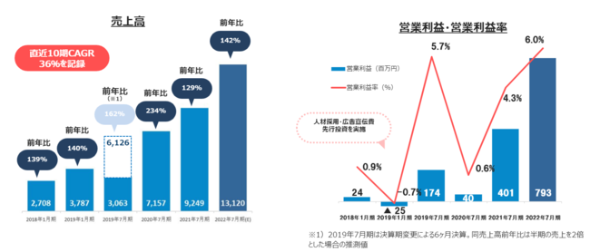 10年連続の増収を維持、売上・利益ともに過去最高を更新しました。また、直近10期での年平均成長率(CAGR)は、36%を記録しております。
