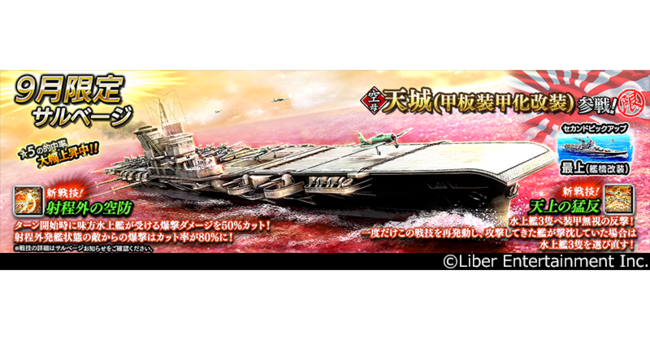 株式会社リベル・エンタテインメントは、男性向けオリジナルタイトル『蒼焔の艦隊』(そうえんのかんたい、iOS/Android/DMM Games)について、本日9月14日(水)より、新たに天城(甲板装甲化改装)が参戦する限定サルベージが開催されたことをお知らせいたします。