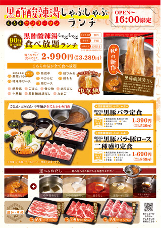 また今回のフェアではランチタイム(開店から16:00迄)にご注文可能な黒酢酸辣湯しゃぶしゃぶ食べ放題ランチや、鹿児島県産黒豚バラとどん亭自慢の豚ロースを組み合わせた二種盛り定食をご用意いたしました。食べ放題ランチは内容そのままで90分制となり、お値段が300円お得になっております。