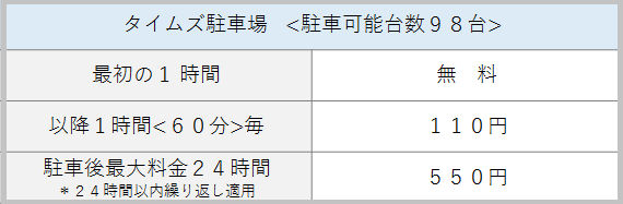 1時間110円、駐車後最大料金24時間550円で留め置き可能。ターミナルまでは徒歩数分と利便性も良いですので、ぜひご利用ください。