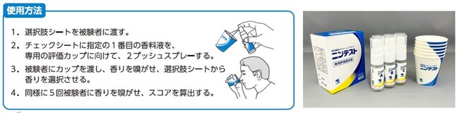 香りによる認知機能スクリーニングキットです。評価カップにスプレーした6種類の香料液の香りを被験者に嗅いでいただき、回答から算出したスコアにより認知機能のレベルを判定します。約5分のテスト時間で迅速に判定ができ、被験者の負担も少ない点が特徴で、全国の人間ドック施設、健診センター等に販売しています。小林製薬では、本製品を定期的なヘルスチェックの一つとして多くの皆さまにご利用いただくことで、健康増進の意識を高め、自分らしく豊かな生活を送ることのできる社会実現への貢献を目指しています。