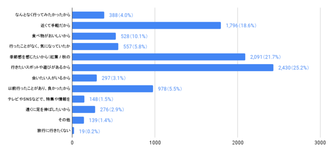 お出かけ先を選んだ理由を聞く質問では、「季節感を感じたいから(紅葉/秋の味覚)」という回答が全体の40.9.%という結果になりました。次いで「なんとなく行ってみたかった」20.8%、「以前行ったことがあり、良かったから」14.4%という結果になりました。
