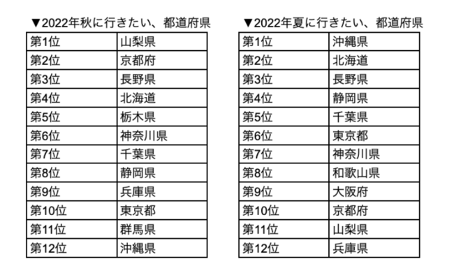 当社が2022年7月15日に公開した調査リリース(※注1)「この夏、旅行に行きたい都道府県ランキング」と今回の結果を比較すると、「この秋に行きたい都道府県ランキング」は行きたい都道府県、遊び先で大きく内容が変化する結果となりました。