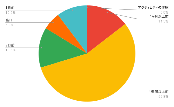 体験の予約実施時期に関する問いでは、全体の70.3%が1週間以上前には予約すると回答しました。2日前に予約する13.5%、1日前に予約する10.2%、当日に予約する6%という回答となっています。