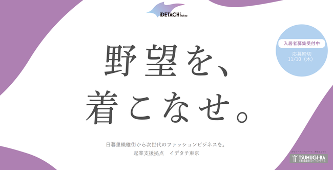 起業支援サービスを展開する株式会社ツクリエ(本社:東京都千代田区 代表取締役:鈴木英樹)は、荒川区から運営受託しているファッション特化型起業支援拠点「イデタチ東京」の個室オフィス・シェアオフィスの入居者募集を9/15(木)より開始します。応募締切は、11/10(木)。