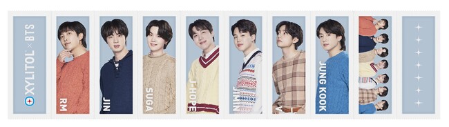 BTSメンバー7人の笑顔が360°デザインされたプレミアム缶の中に、メンバーがデザインされた個包装のキシリトール板ガムが20枚入っています。缶のデザインは全4種類、ガムの個包装のデザインは全10種類です。