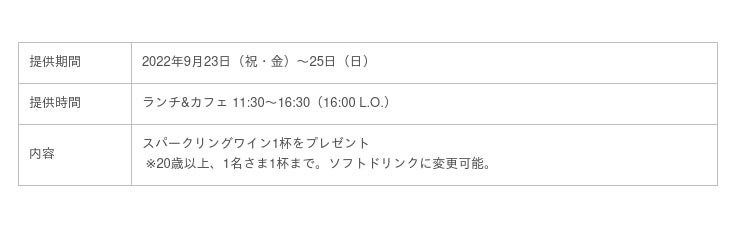 クロスホテル京都併設レストラン「KIHARU Brasserie」では、3日間限定で、ランチ&カフェタイムにご来店いただいた皆さまに、開業4周年のお祝いと日ごろのご愛顧に感謝し、スパークリングワインをプレゼントします。