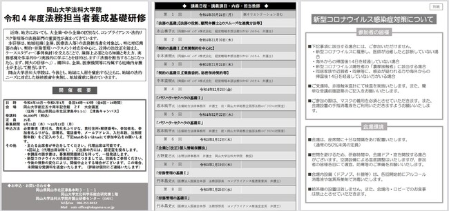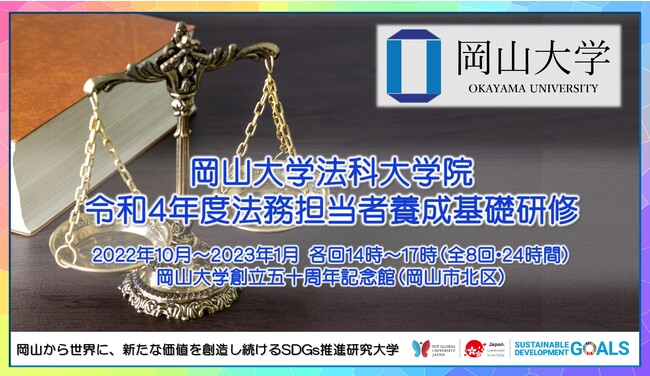【岡山大学】岡山大学法科大学院「令和4年度法務担当者養成基礎研修」〔2022年10月~2023年1月 各回14時~17時(全8回・24時間)〕