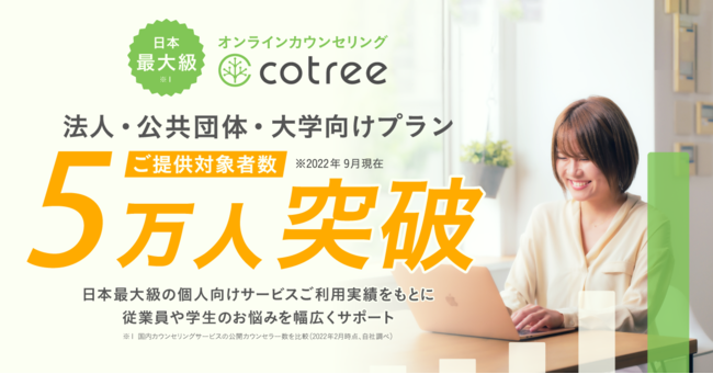 オンラインカウンセリング・コーチングの「cotree」を展開する株式会社cotree(本社:東京都港区、代表取締役:西岡 恵子、以下cotree)は、2014年10月にサービス開始以降、「法人・団体向けプラン」と「大学向けプラン」の合計ご提供対象者数が5万人を突破しました。