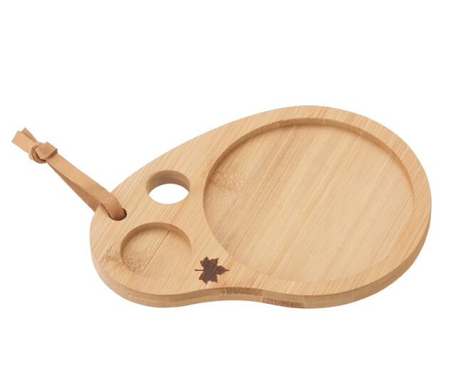 「Banboo ハンディプレートまな板」は、食事シーンではプレート、裏面はまな板としても使用できる便利なアイテムです。プレートとして使用する時は、穴に指を通して持つと安定して持てるほか、仕切りがあるのでソースなどの調味料を入れるのにたいへん便利です。吊り下げ紐も付いているため、収納や乾燥の際に吊り下げることもできます。