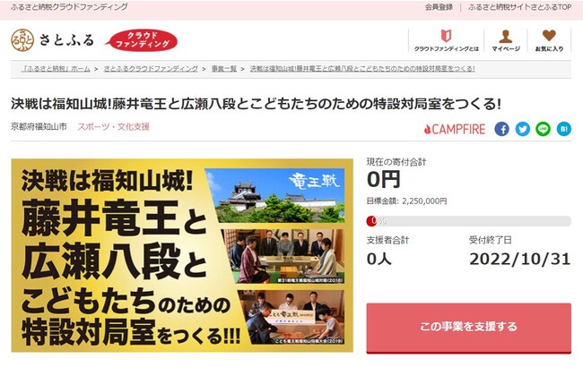 京都府福知山市とふるさと納税ポータルサイト「さとふる」(https://www.satofull.jp/)を運営する株式会社さとふる(本社:東京都中央区、代表取締役社長:藤井 宏明)は、寄付金の使途に応じて事業を立ち上げ寄付を募る「さとふるクラウドファンディング」(https://www.satofull.jp/projects/top.php)にて、2022年11月8日、9日に福知山城で開催される竜王戦で、藤井聡太竜王と広瀬章人八段が使用する対局室を整備するため、2022年9月20日より寄付受け付けを開始します。