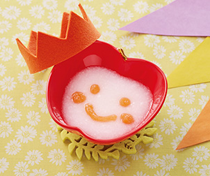 まずは、おかゆ状の主食メニューに野菜や果物のベビーフードを使って絵を描く簡単離乳食アレンジ。一皿で主食と一緒に野菜や果物が取れるのもうれしい一品。「かわいいね♪」と赤ちゃんとコミュニケーションを取ったり、王冠の飾りを添えればハーフバースデーにも最適!