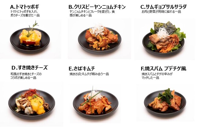 A.トマトッポギ/B.クリスピーヤンニョムチキン/C.サムギョプサルサラダ/D.すき焼きチーズ/E.さばキムチ/F.焼きスパム プデチゲ風
