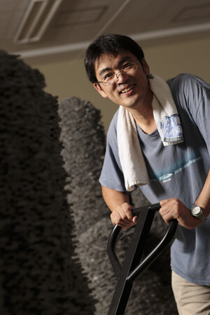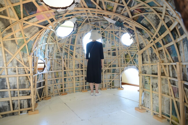同プロジェクトは、普段は廃棄してしまうものを材料に使って加工し、アート作品によみがえらせる取り組みです。毎日新聞とネスレ日本の両社は、印刷工場から出る損紙(新聞の刷り損じの紙)やコーヒーブランド「ネスカフェ」の店舗から出るコーヒーかすを用意。第27回UBEビエンナーレで宇部商工会議所賞受賞の彫刻家・北川太郎氏にこれらを使ったアート作品を制作していただきました。作品は、竹で枠組みを作り、損紙を貼って、ドーム型にし、表面に丁寧にコーヒーかすが塗り固められています。見るだけでなく、触ったり、中に入ることもできるもので、会場の雰囲気とも調和した親しみのある作品に仕上がりました。タイトルは「心景(しんけい)」。作品の周囲にはコーヒーの香りが香ばしく漂うのも特徴です。香りが媒介となって見る人の心に残る景色としてこの作品が記憶されることを期待しています。