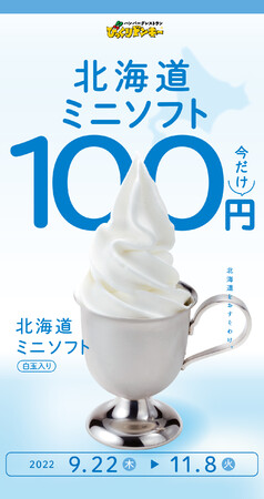 株式会社アレフ(本社:北海道札幌市、代表取締役社長:庄司 大)が展開するハンバーグレストラン「びっくりドンキー」は、9月22日(木)~11月8日(火)の期間限定で、通常価格200円(税込)の「北海道ミニソフト」を100円(税込)で販売します。