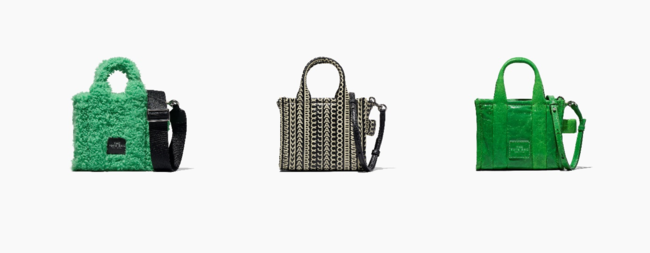 左から、ザ テディ トート バッグ マイクロ ¥36,300 /ザ モノグラム レザー トート バッグ マイクロ ¥62,700 /ザ シャイニー クリンクル トート バッグ マイクロ ¥59,400