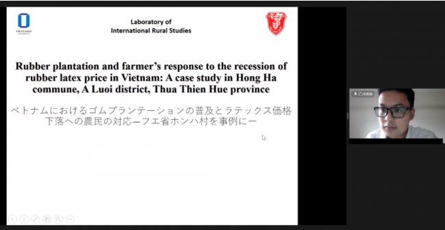 国立大学法人岡山大学(本部:岡山市北区、学長:槇野博史)は、2022年9月6日、「岡山大学・フエ大学院特別コース」修了報告会をオンラインで実施しました。ベトナム国フエ大学との共同プログラムである本コースのベトナム人留学生は、昨年4月に岡山大学大学院環境生命科学研究科博士前期課程2年に転入学しましたが、新型コロナウイルス感染症の流行により半年間の休学となり、復学後7カ月はオンラインで、本年5月からは渡日して5カ月間研究に取り組んできました。本会は、その成果として、修士論文の概要を発表するとともに、彼らを生活面および精神面で支援してきた里親企業に、コース修了を報告することを目的に開催されました。