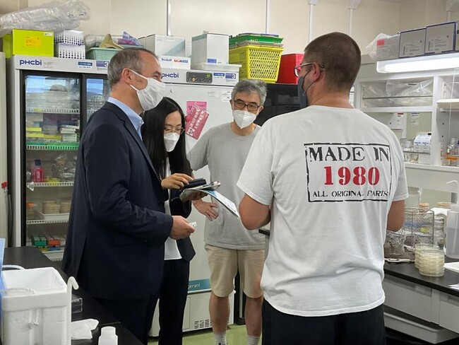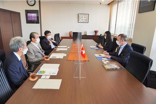 表敬訪問では、メスナー領事館長から、スイスの若者の海外でのスタートアップを推進しており、スタートアップと大学をつなぐ取組みについて紹介がありました。これを受けて那須理事は、本学で発見されたがん治療遺伝子を用いた、遺伝子治療による次世代がん治療薬の創製事業に取り組む本学発のスタートアップ企業について説明しました。