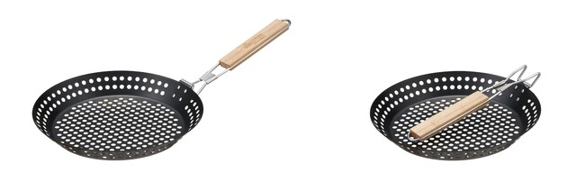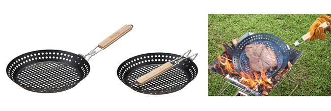 本アイテムは、薪火や炭火の上で炎にかざして調理するグリルパンです。