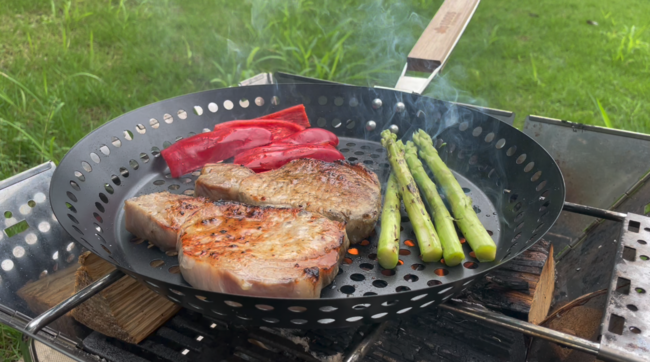 アウトドアでしか味わえない薪火・炭火料理におすすめの本製品は、たくさんの穴があることで余分な油や水分を落とすことができ、ヘルシーでありながら薪や炭の香りをまとったスモーキーなアウトドア調理を実現します。