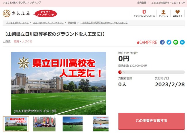 山梨県とさとふる、日川高校グラウンドを人工芝生にするため寄付受け付けを開始