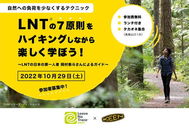 2003年の創業以来、社会貢献を経営の礎とするアウトドア・フットウェアブランド『KEEN(キーン)』(キーン・ジャパン合同会社 東京都港区 代表:竹田尚志)は、環境に対するインパクトを最小限にして、アウトドアを楽しむための環境倫理プログラム [Leave No Trace(リーブ・ノー・トレース)]を学ぶワークショップ <LNTの7原則をハイキングしながら楽しく学ぼう!~LNTの日本の第一人者 岡村泰斗さんによるガイド~ >を2022年10月29日(土)、高尾山口駅前活動ホテル「タカオネ」と、高尾山周辺にて開催いたします。