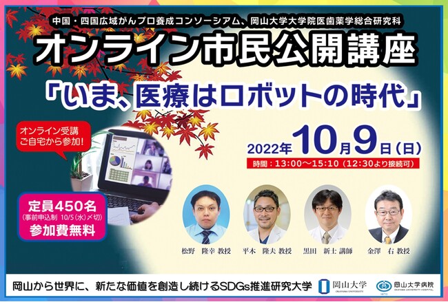 【岡山大学】中国・四国広域がんプロ養成コンソーシアム オンライン市民公開講座「いま、医療はロボットの時代」〔10/9日, オンライン〕