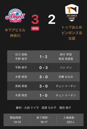 木下アビエル神奈川とトップおとめピンポンズ名古屋の試合は3-2で木下アビエル神奈川が勝利しました。