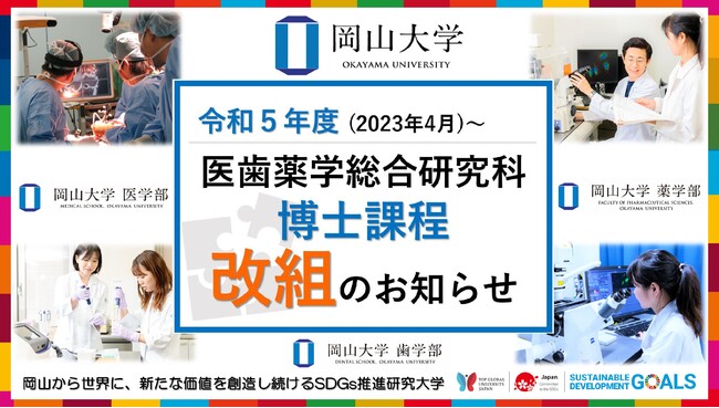 国立大学法人岡山大学(本部:岡山市北区、学長:槇野博史)の大学院医歯薬学総合研究科博士課程では、令和5(2023)年4月より、研究テーマによって包括された現在の4専攻から、大括り化された「医歯薬学専攻」へ改組することとなりました。