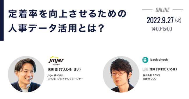こうした状況のなか、入社者の定着率改善を目的とした人事データの形成とその活用が注目を集めています。 そこで、この度back checkでは、jinjer株式会社 CHO室 ジェネラルマネージャーの末廣征 氏をゲストにお迎えし、「人事データの活用」をテーマにセミナーを開催する運びとなりました。ROXX 取締役COOの山田浩輝とのパネルディスカッション形式にて、人事データの具体的な活用方法や事例をお伝えします。
