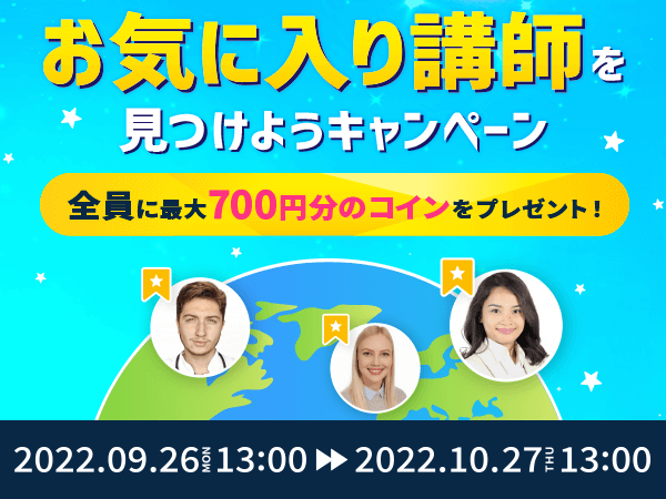 ネイティブスピーカーと回数無制限のオンライン英会話サービス「ネイティブキャンプ英会話」を展開する株式会社ネイティブキャンプ(東京都渋谷区 代表取締役:谷川国洋)は2022年9月26日(月)より「お気に入り講師を見つけようキャンペーン」を開催いたします。