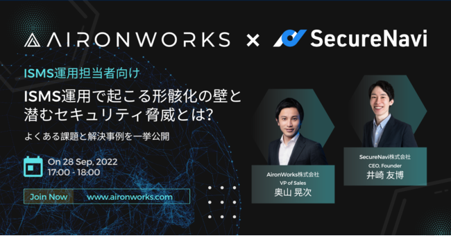 AironWorks株式会社 (本社:東京都港区、代表取締役:寺田 彼日、以下「AironWorks」)は、セキュリティ認証オートメーションツール「SecureNavi」を提供するSecureNavi株式会社(本社:東京都中央区、代表取締役:井崎友博、以下「SecureNavi株式会社」)の井崎氏をゲストに迎え、『ISMS運用で起こる課題とその解決方法』について事例を交え解説するウェビナーを9月28日(水)17時より開催いたします。