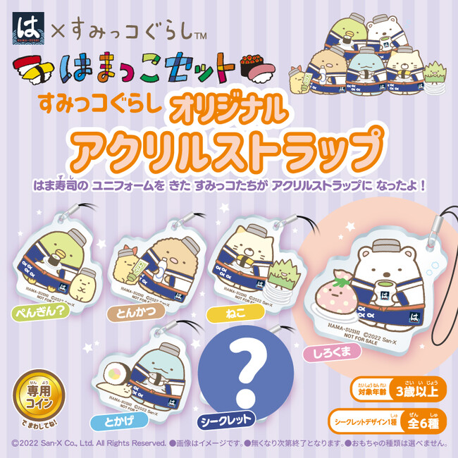 株式会社はま寿司(代表取締役社長:遠藤 哲郎 本社:東京都港区)が展開する100円寿司チェーン「はま寿司」でお楽しみいただける「はまっこセット」のおもちゃに、大人気キャラクター“すみっコぐらし”の「オリジナルアクリルストラップ」と「オリジナル缶バッジ」が限定デザインで9月27日(火)から全国の店舗に登場します。